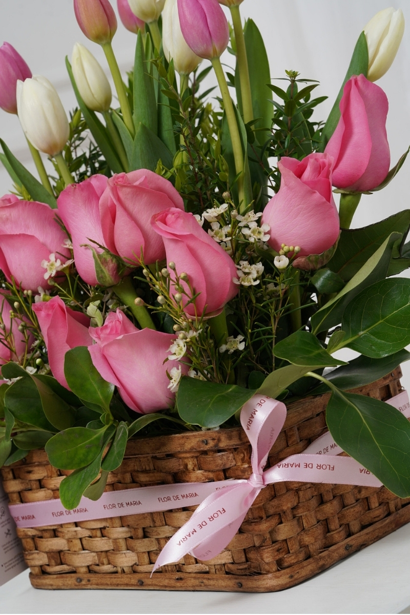 INCLUYE: 10 tulipanes (5 blancos y 5 rosados) + 12 rosas rosadas + follaje natural +base de mimbre + lazo decorativo + tarjeta personalizada.