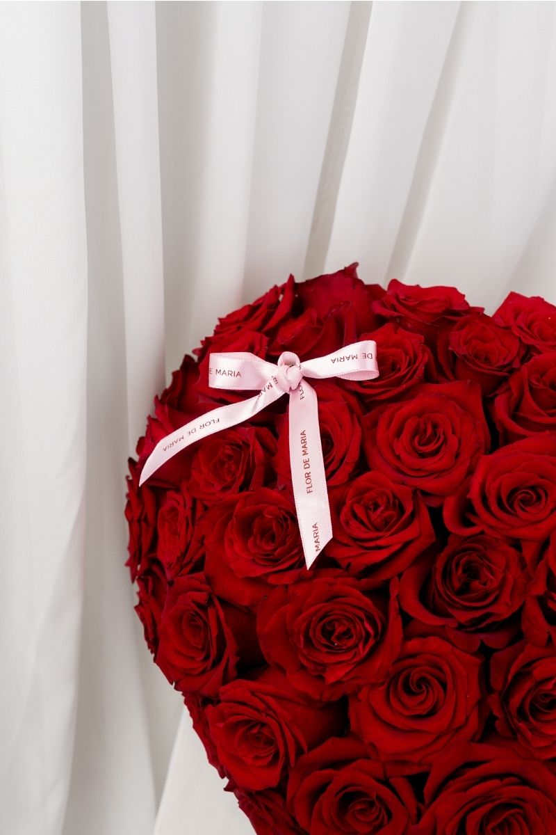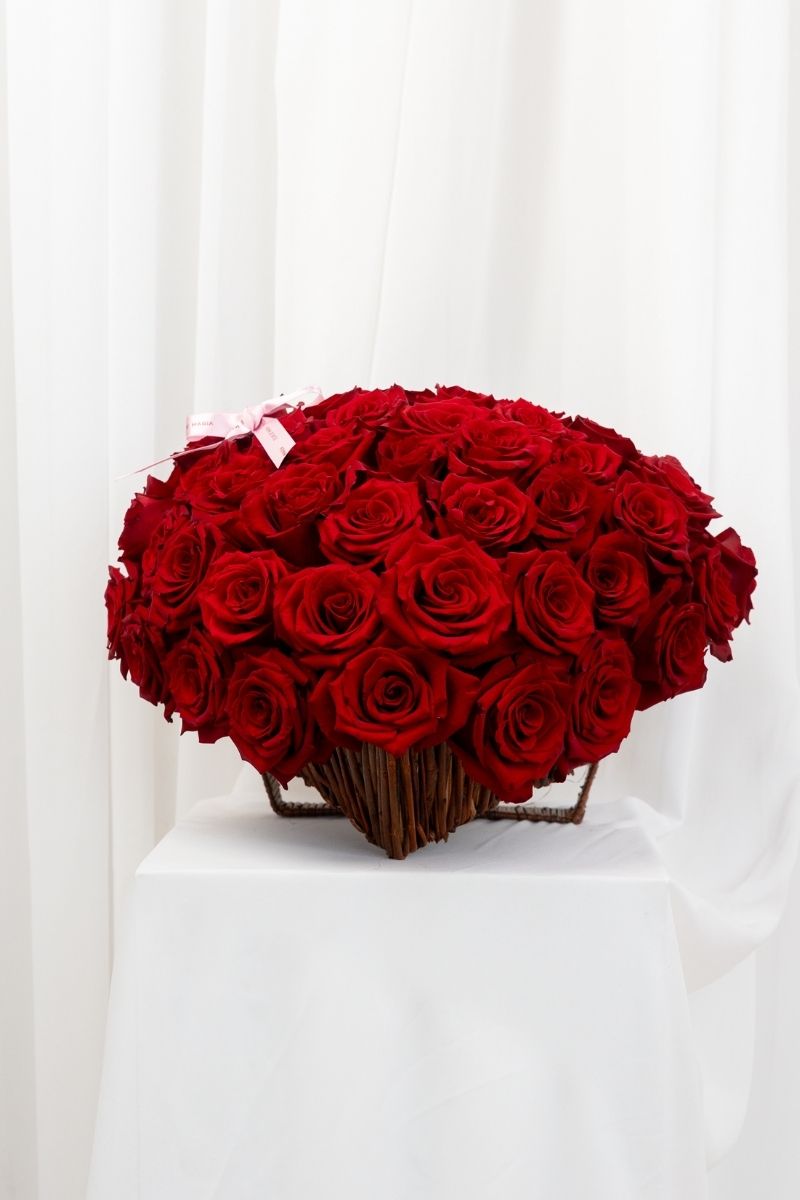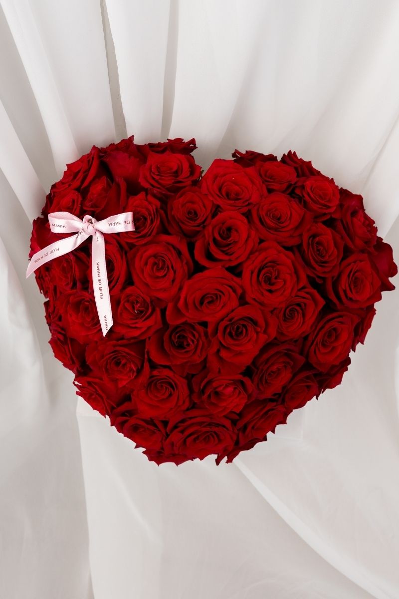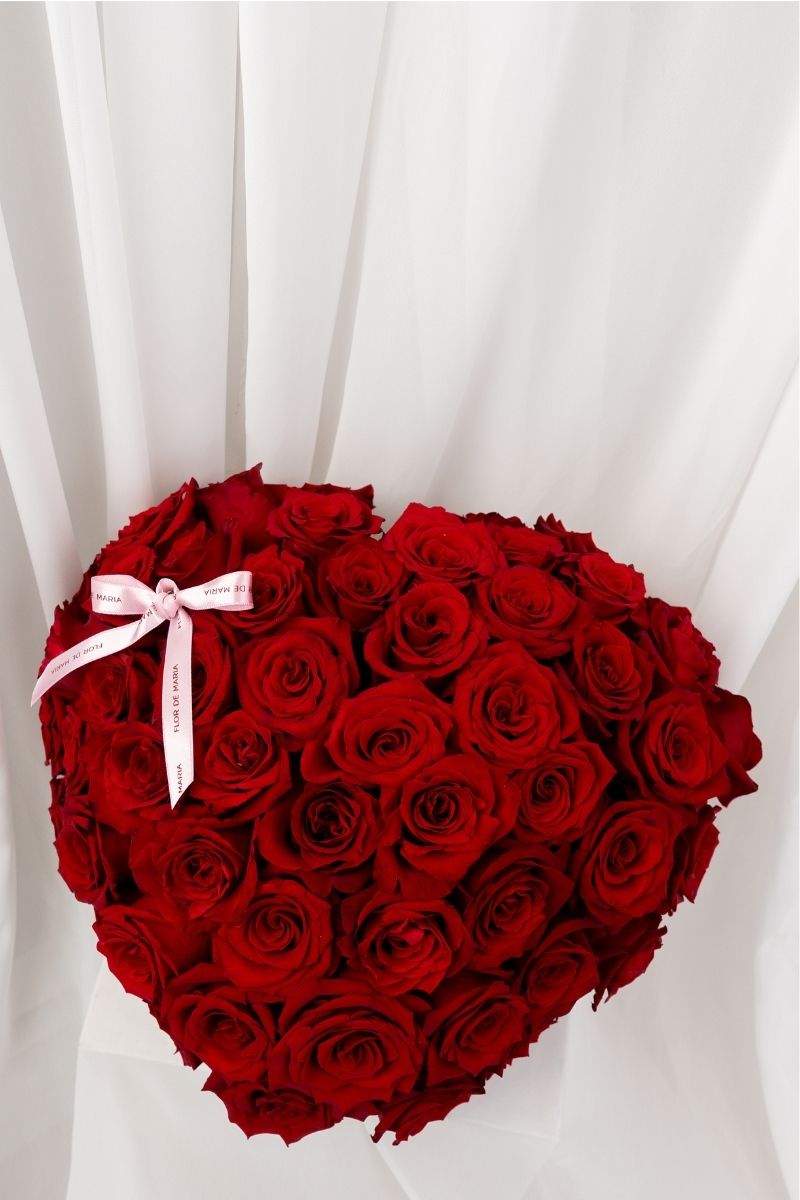 INCLUYE:48 Rosas rojas + canasta en forma de corazón + lazo decorativo + tarjeta personalizada.