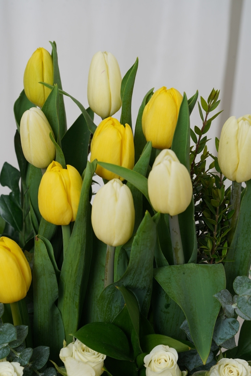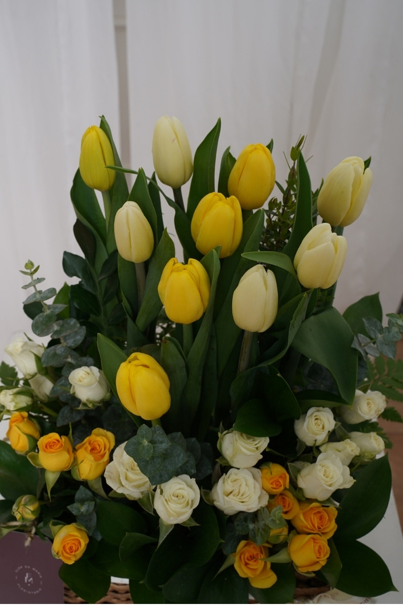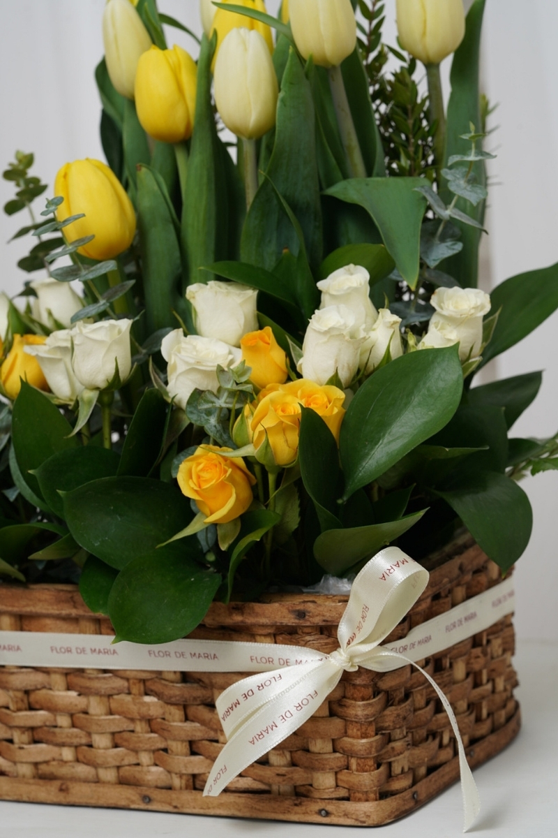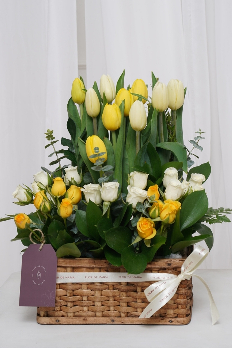 INCLUYE: 10 tulipanes (5 blancos y 5 amarillos) + mini rosas blancas y amarillas + follaje natural +base de mimbre + lazo decorativo + tarjeta personalizada.