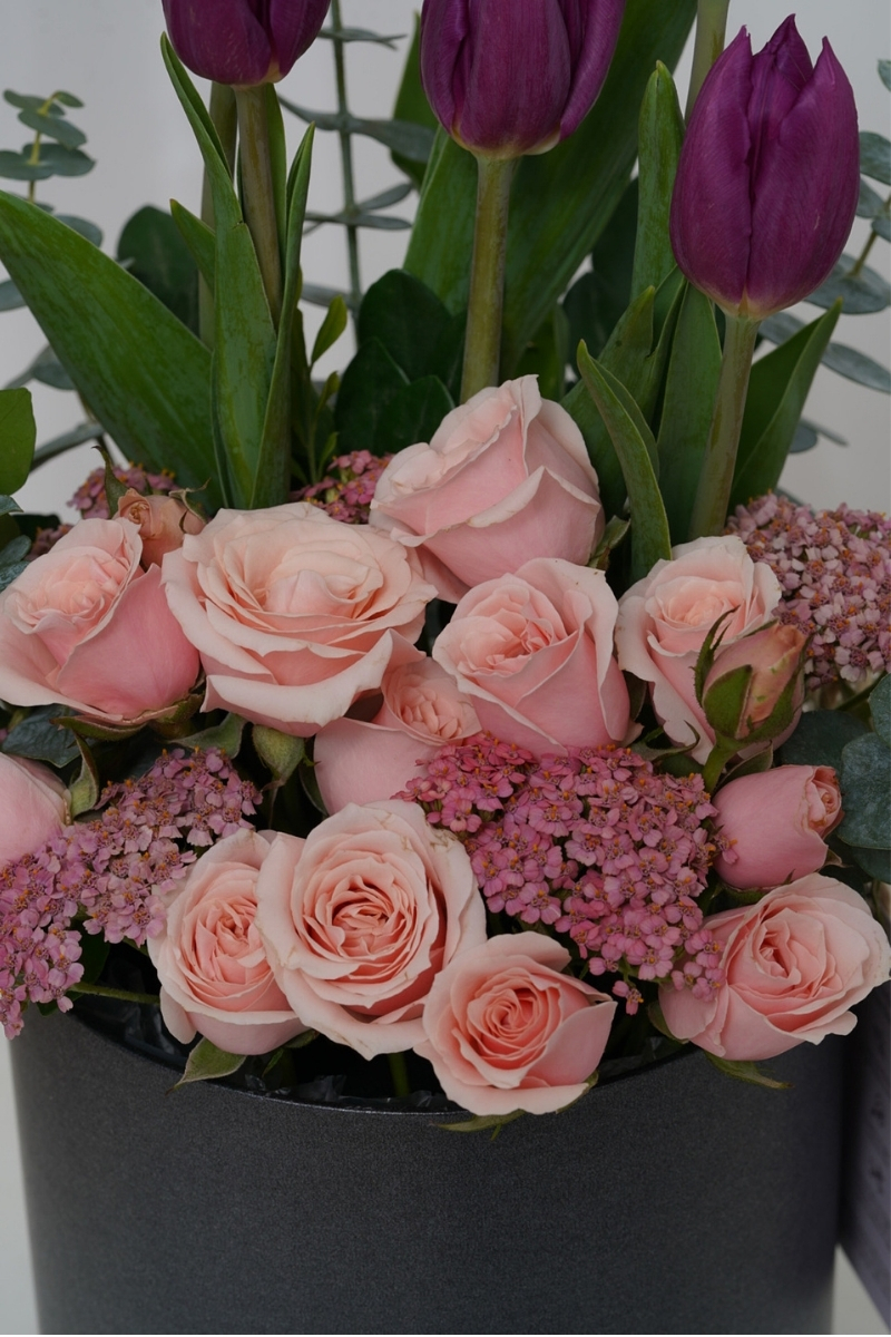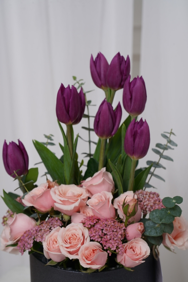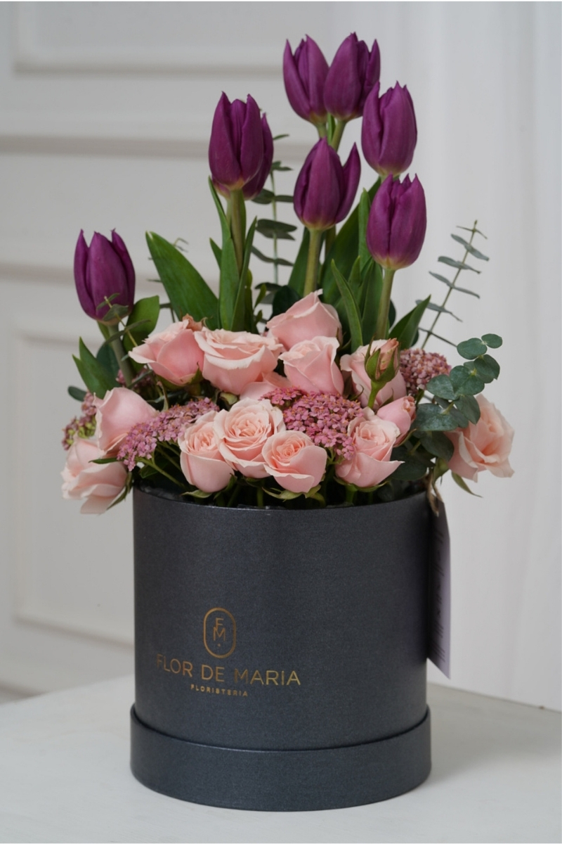 INCLUYE: 8 tulipanes frescos lila + 4 mini rosas + follaje + Lazo decorativo + Tarjeta personalizada.