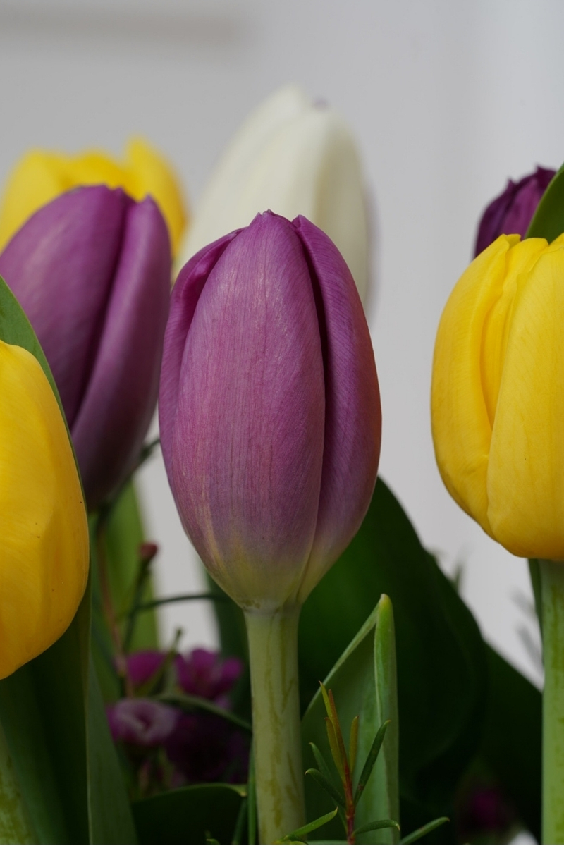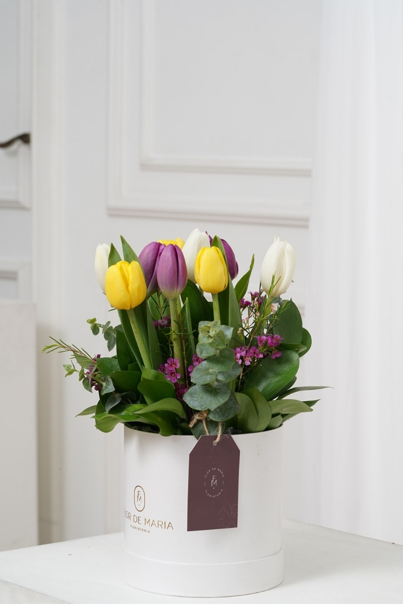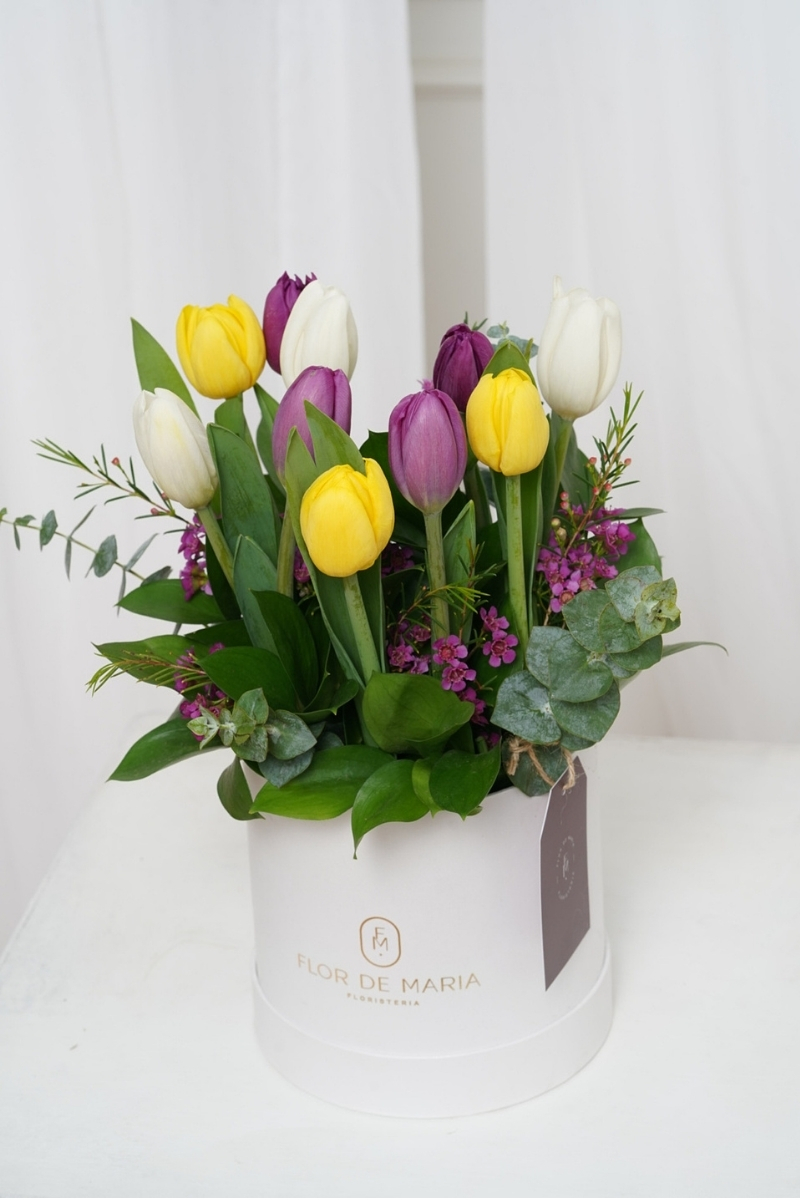 INCLUYE: 9 tulipanes frescos (3 amarillos, 3 lilas y 3 blancos) + follaje + Lazo decorativo + Tarjeta personalizada.
