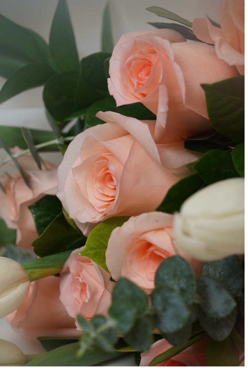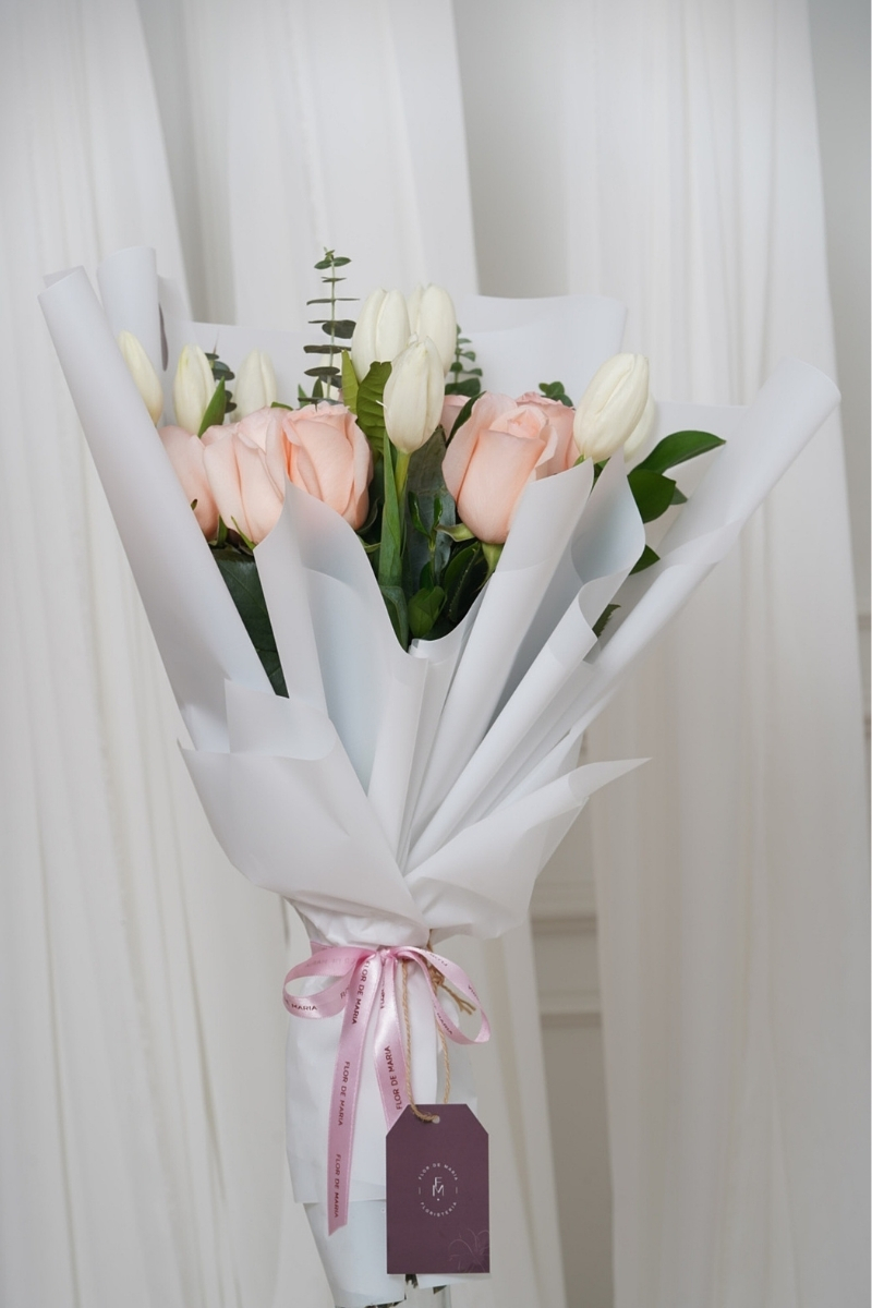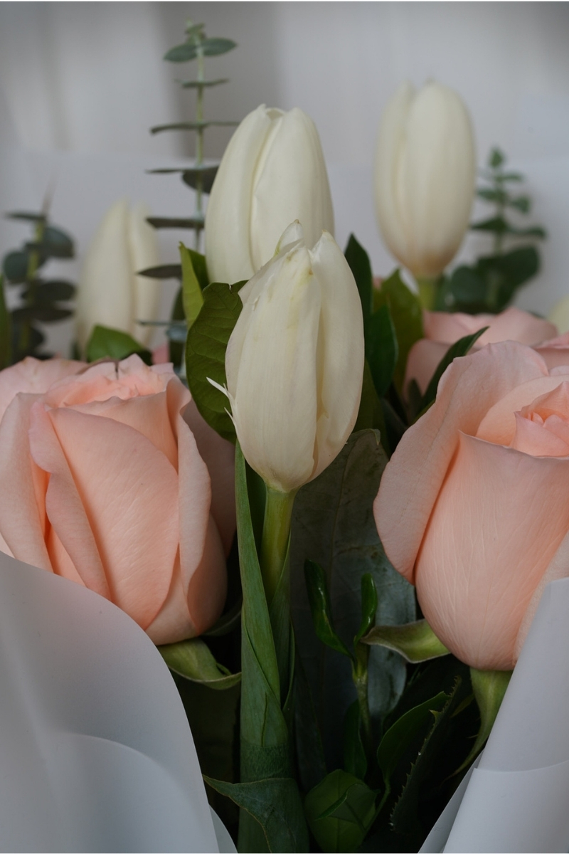 INCLUYE: 12 rosas rosadas + 10 tulipanes blancos + follaje natural + envoltorio en papel coreano de alta calidad+ lazo decorativo + tarjeta personalizada.
