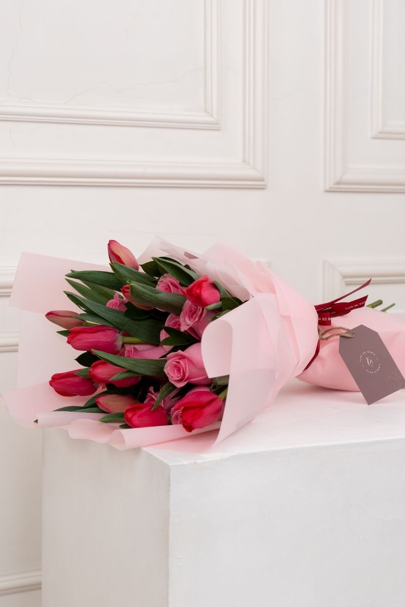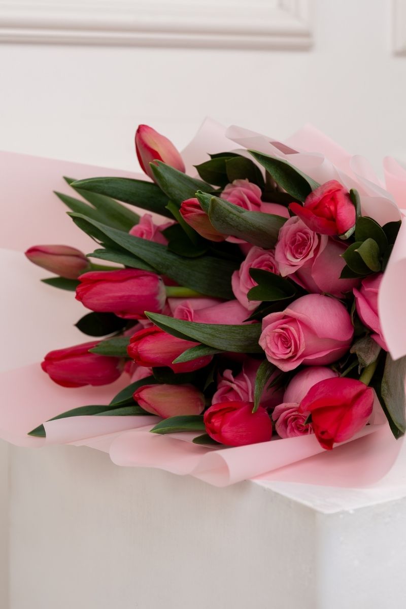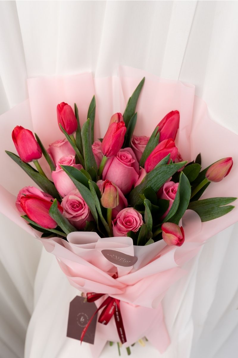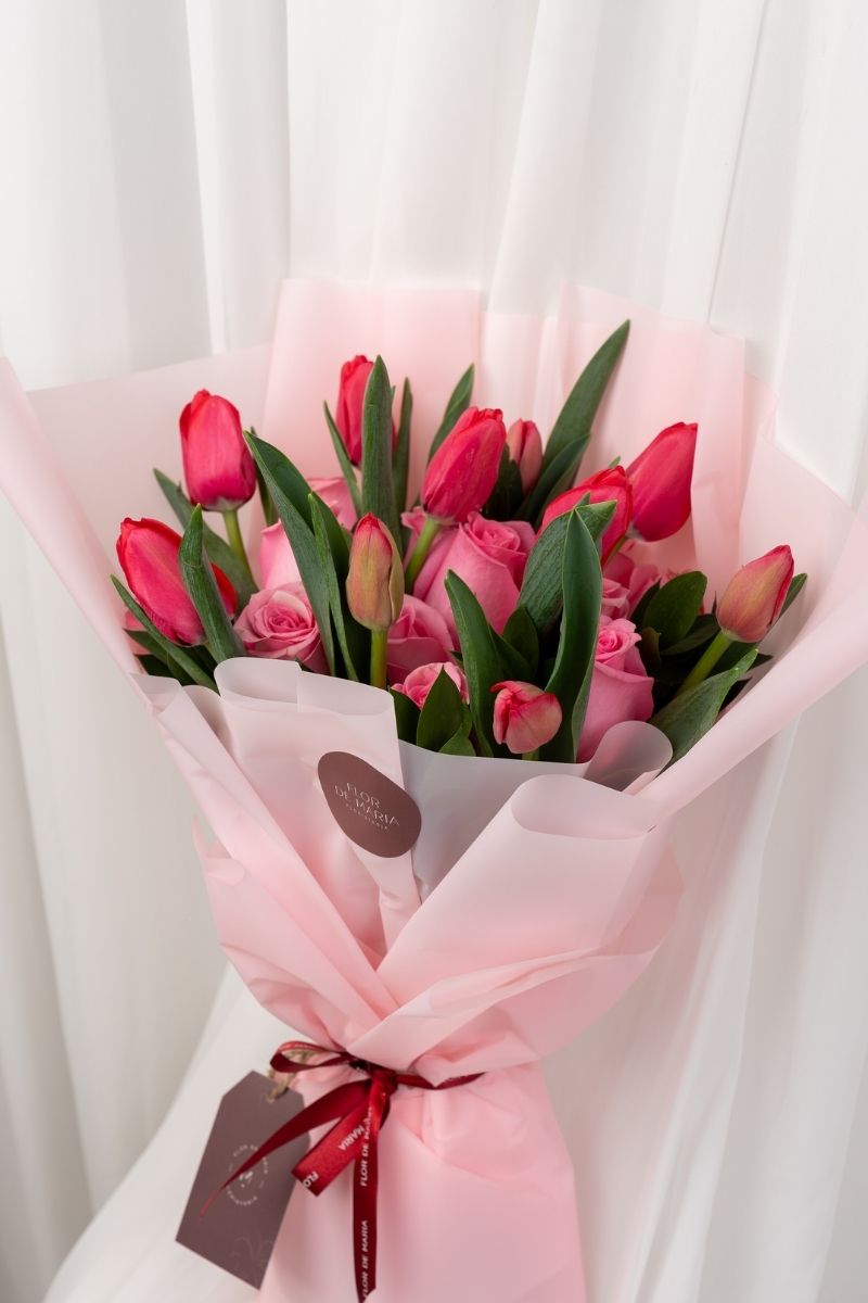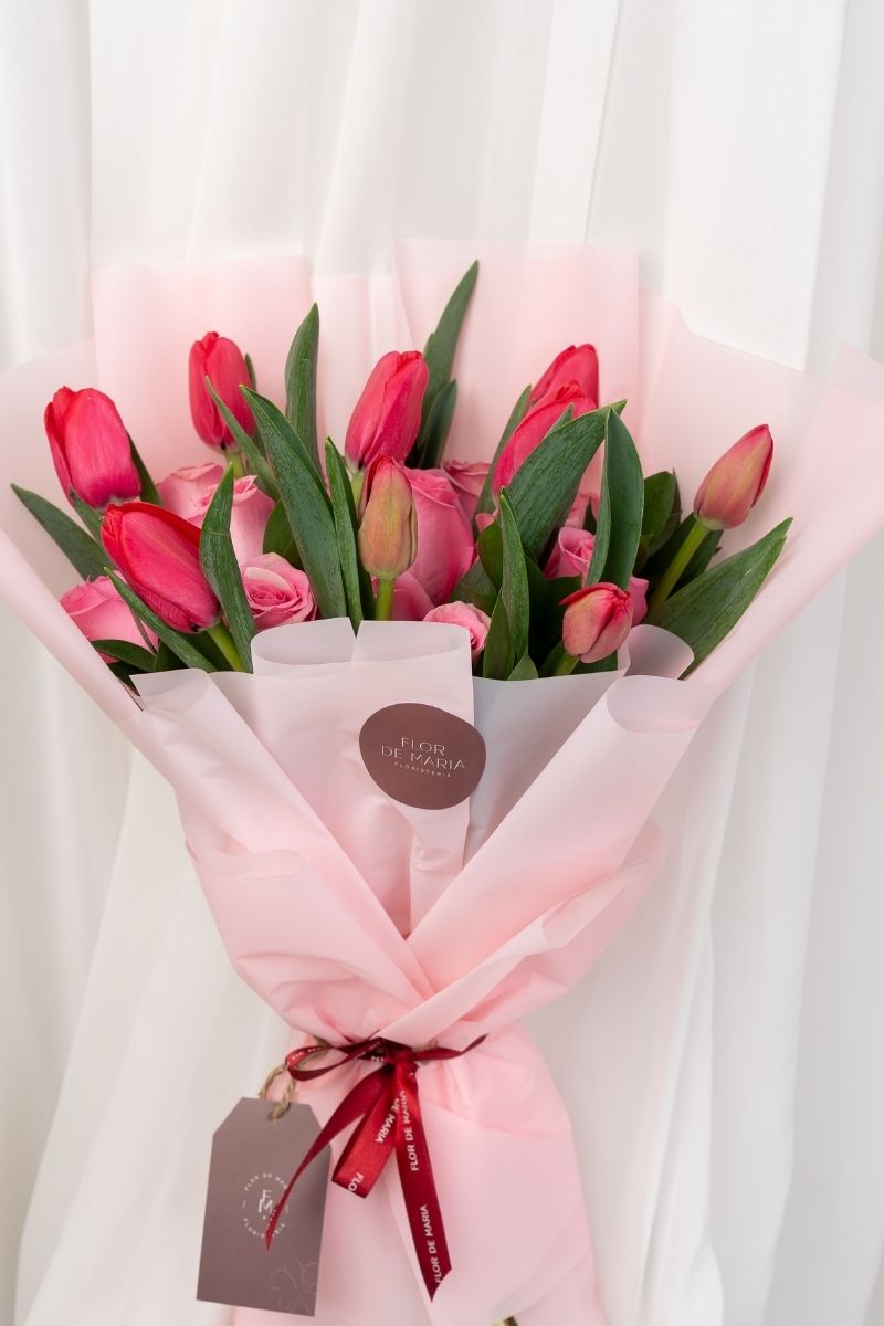 INCLUYE: 12 rosas rosadas + 10 tulipanes rojos + follaje natural + envoltorio en papel coreano de alta calidad+ lazo decorativo + tarjeta personalizada.