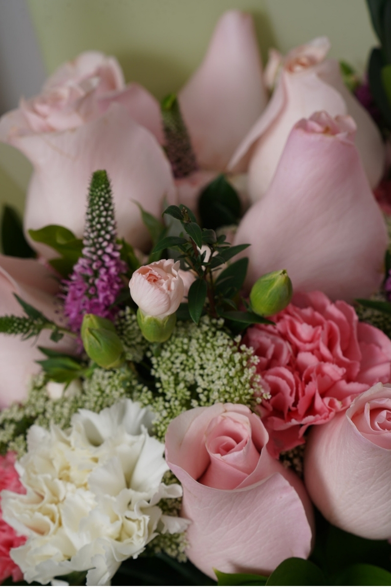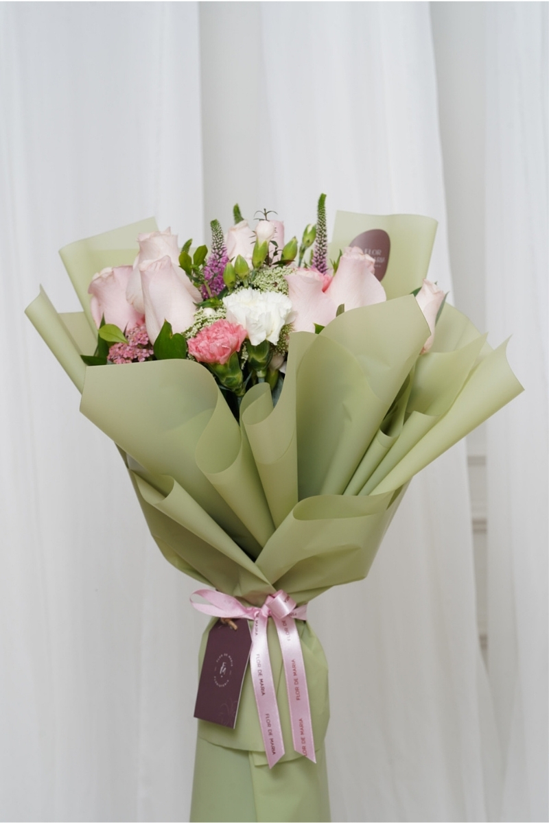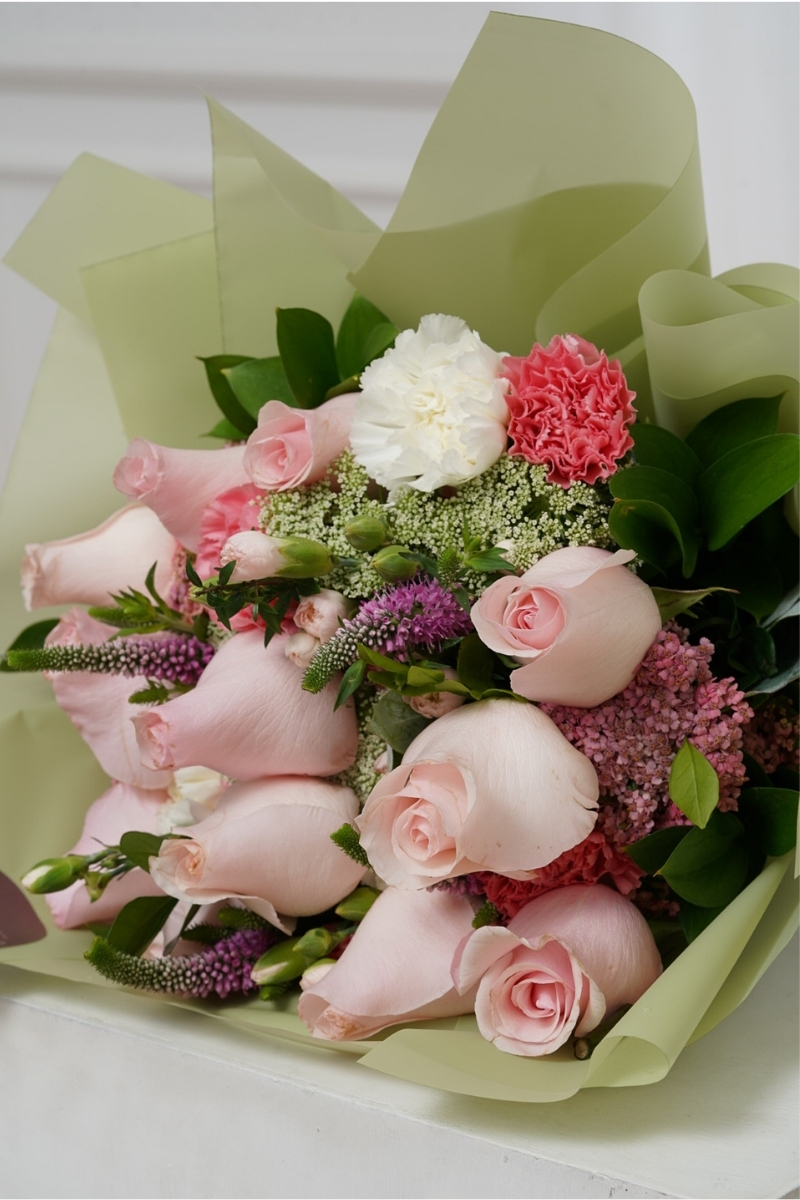INCLUYE: 6 rosas rosadas + 6 rosas blancas + 9 claveles importados + claveles nacionales + achileas + copitos de nieve + follaje natural