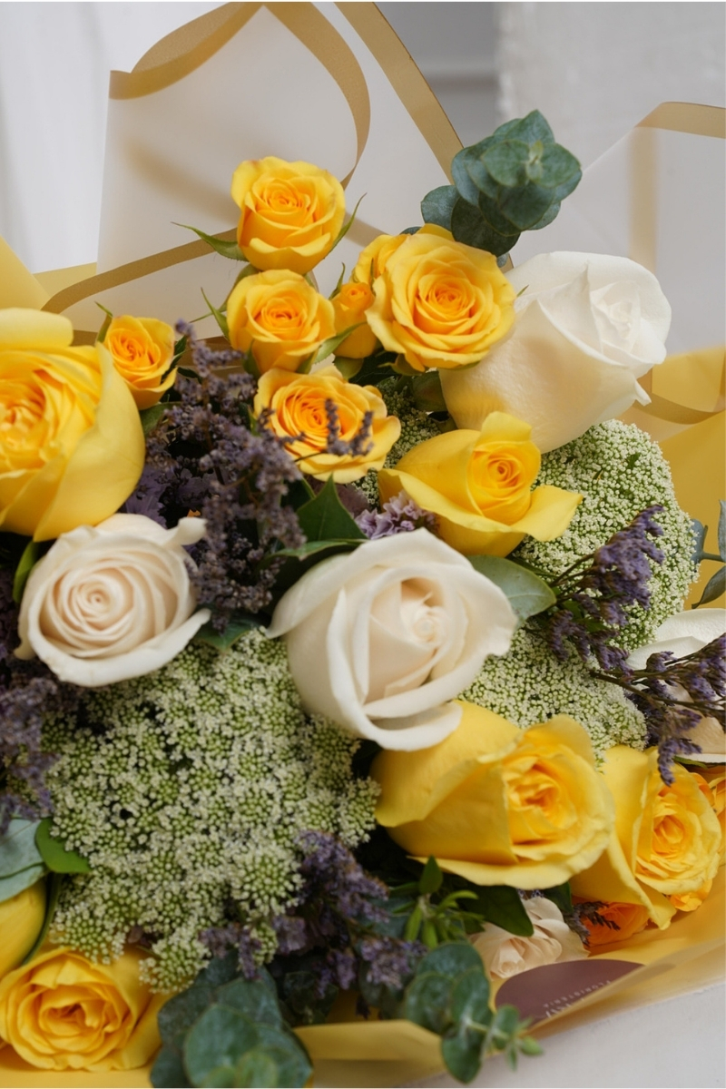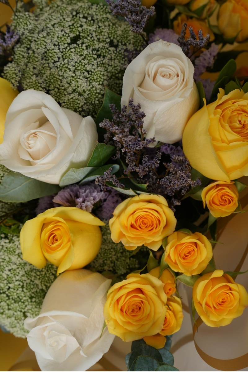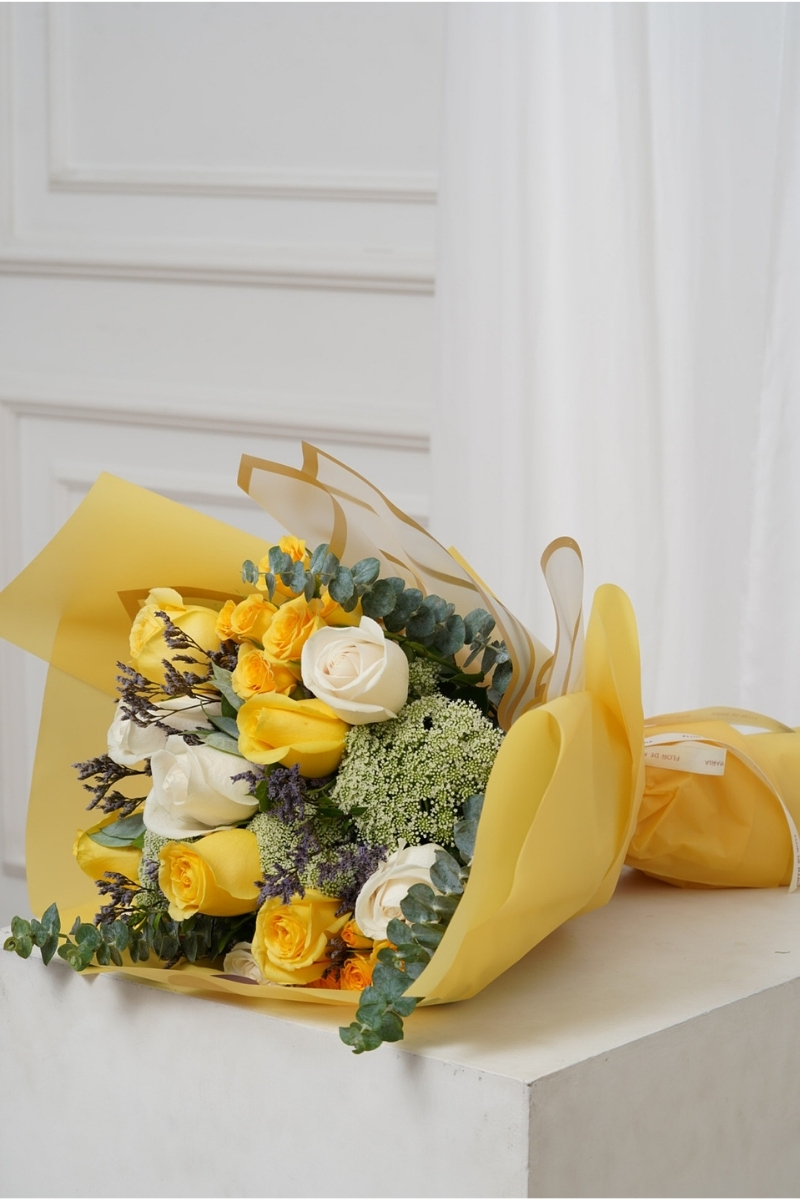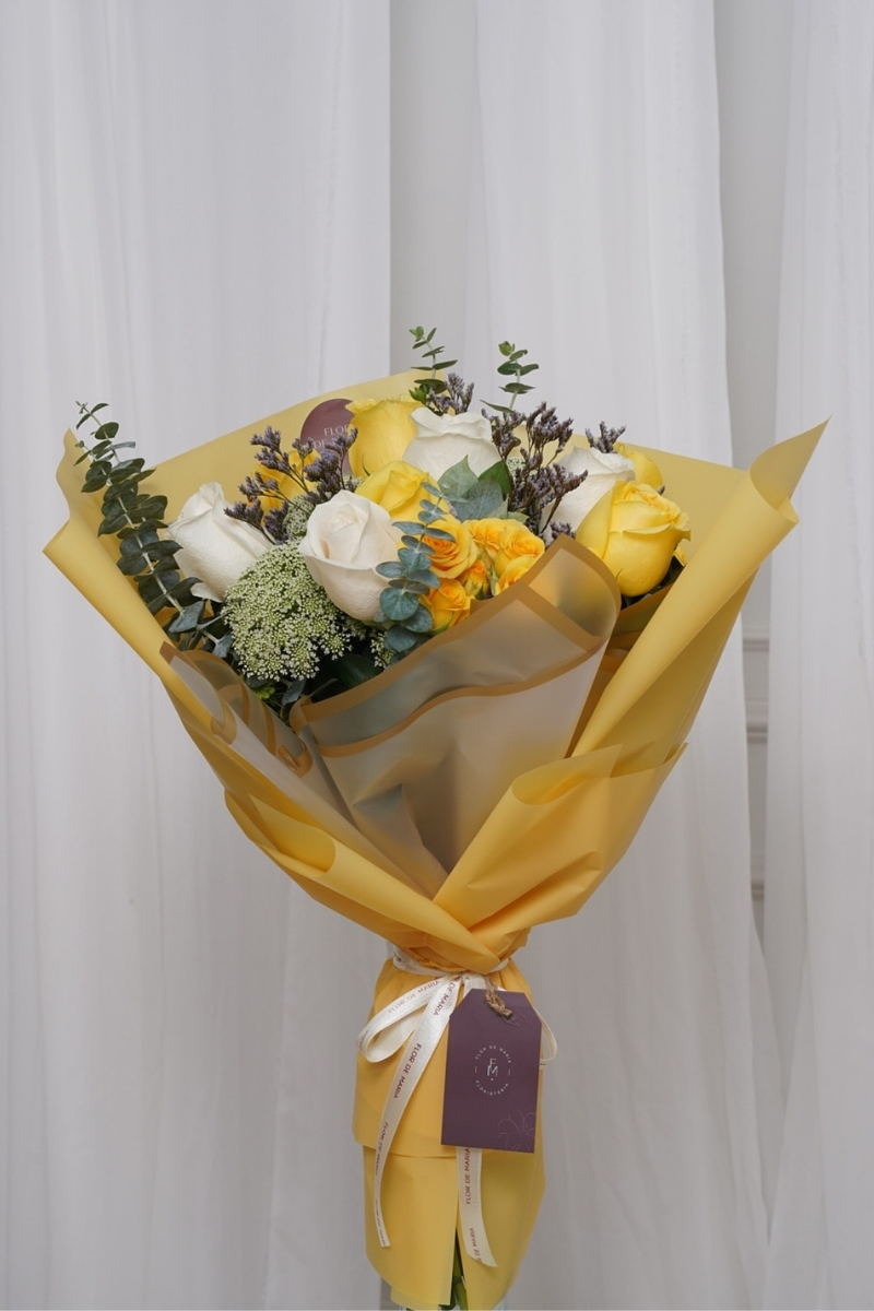 INCLUYE: 5 rosas amarillas + 5 rosas blancas + 3 mini rosas amarillas + claveles nacionales + copitos de nieve + statis + follaje natural