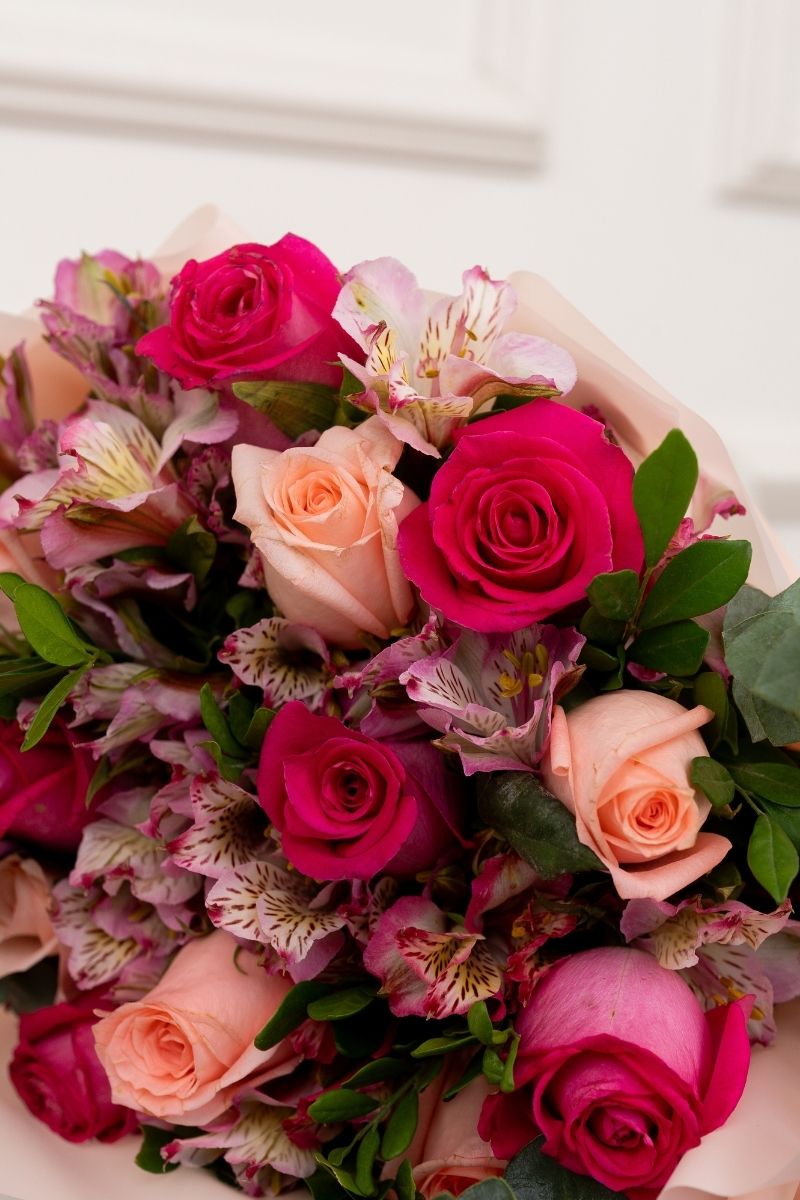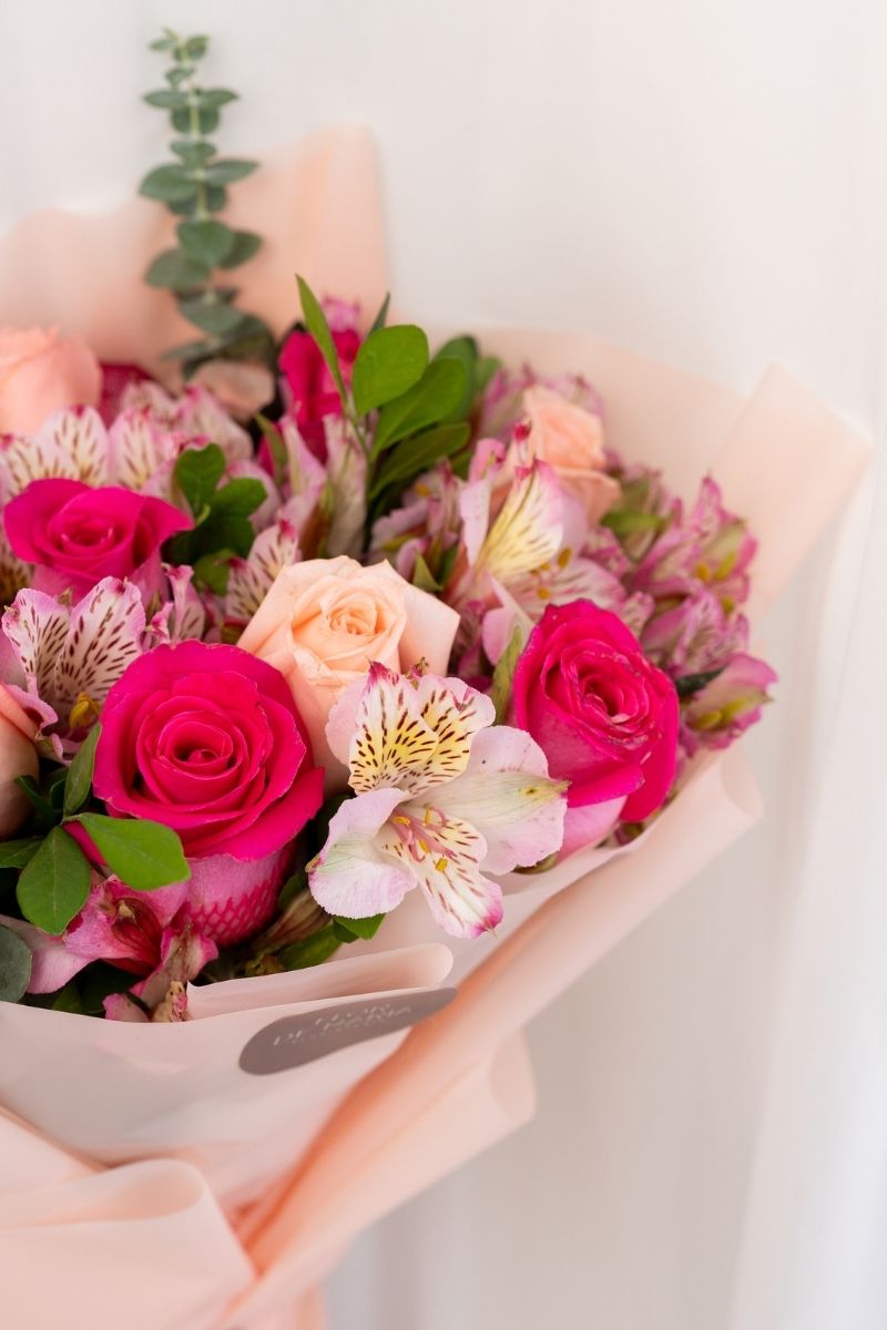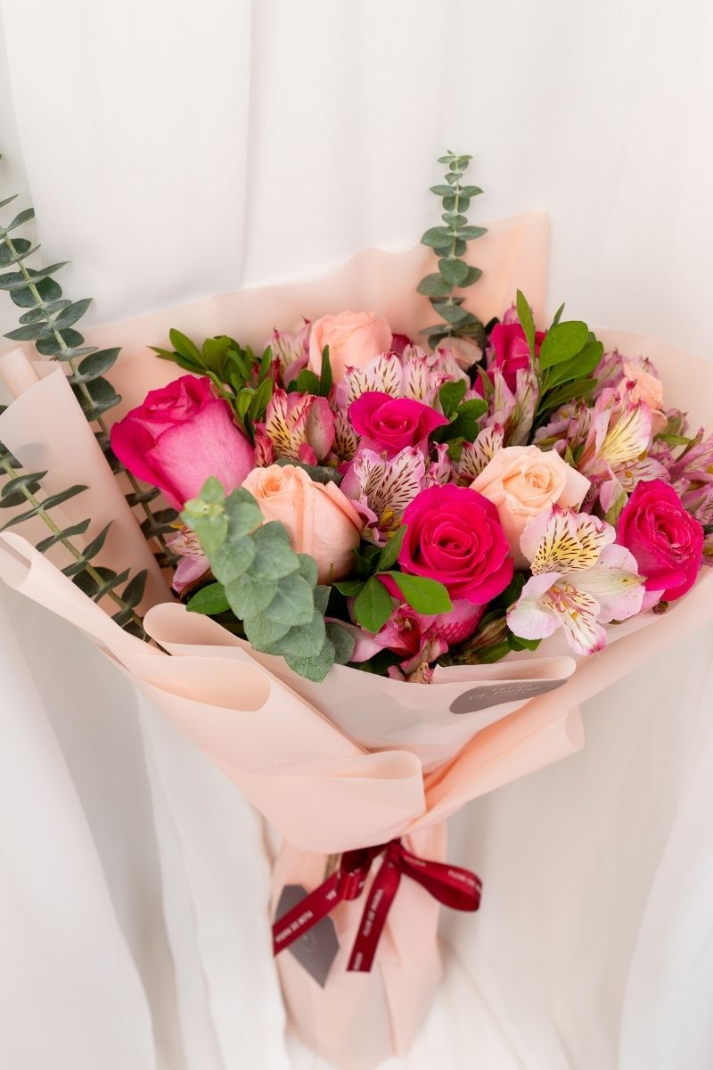 INCLUYE: 12 rosas rojas + astromelias + follaje natural + envoltorio en papel coreano de alta calidad+ lazo decorativo + tarjeta personalizada.