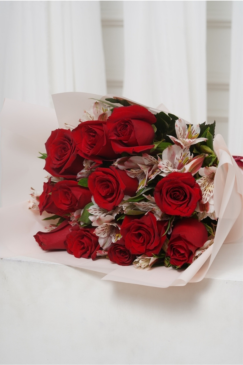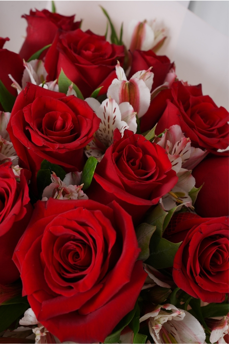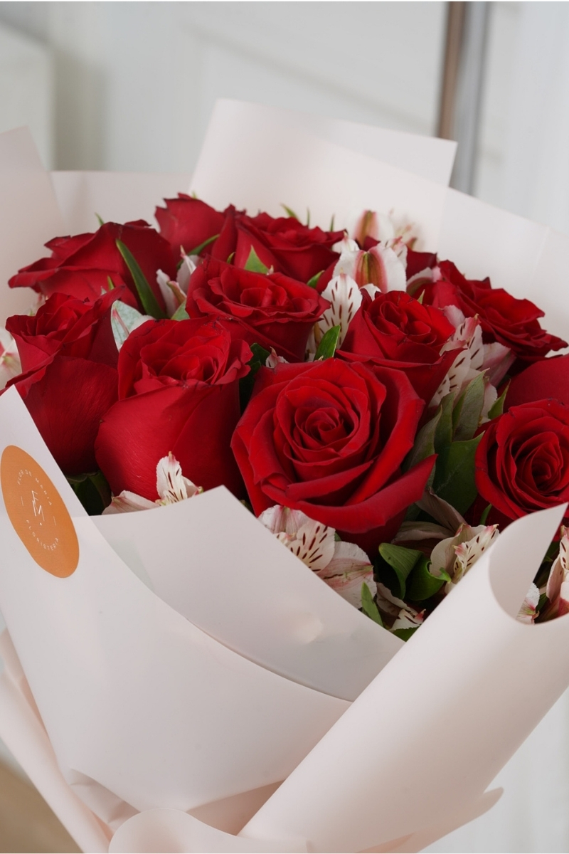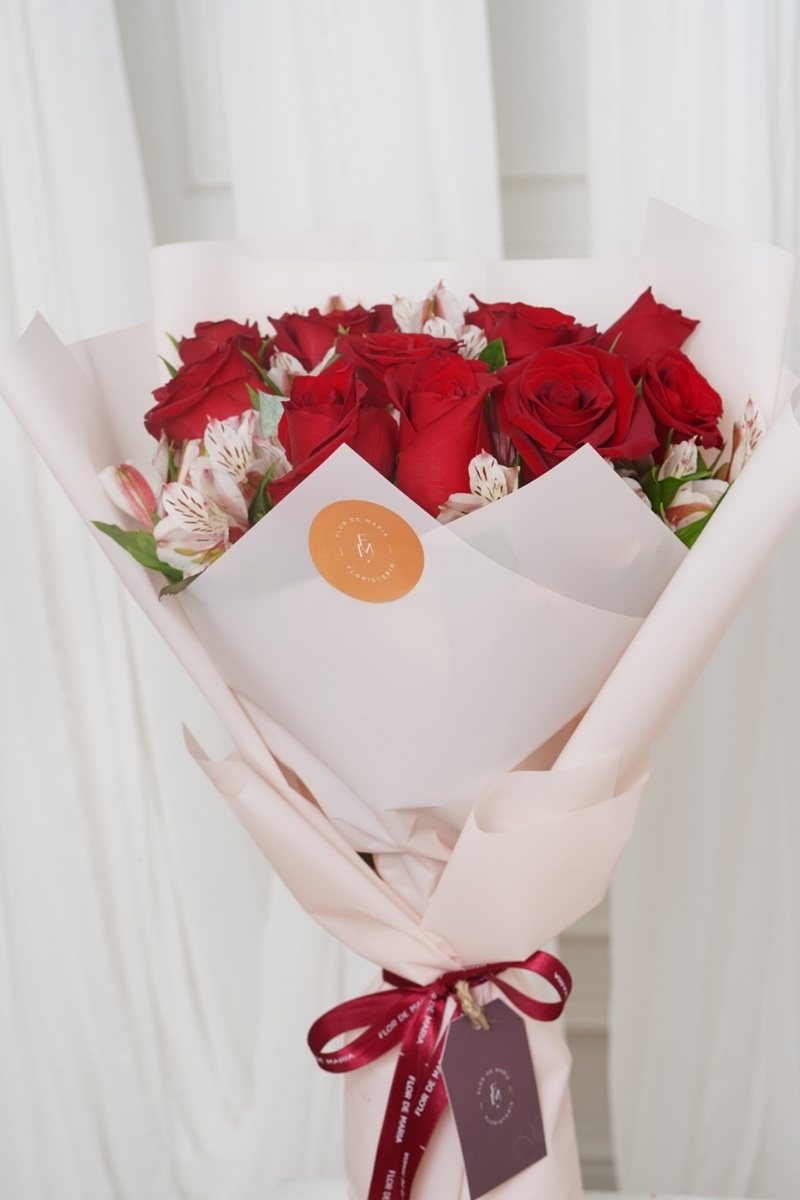 INCLUYE: 12 rosas rojas + 4 astromelias rosadas o blancas + follaje natural