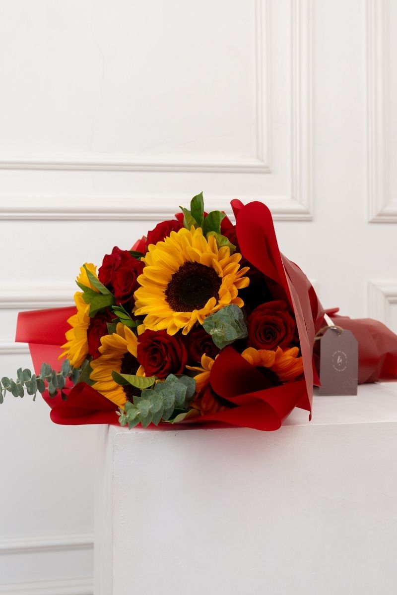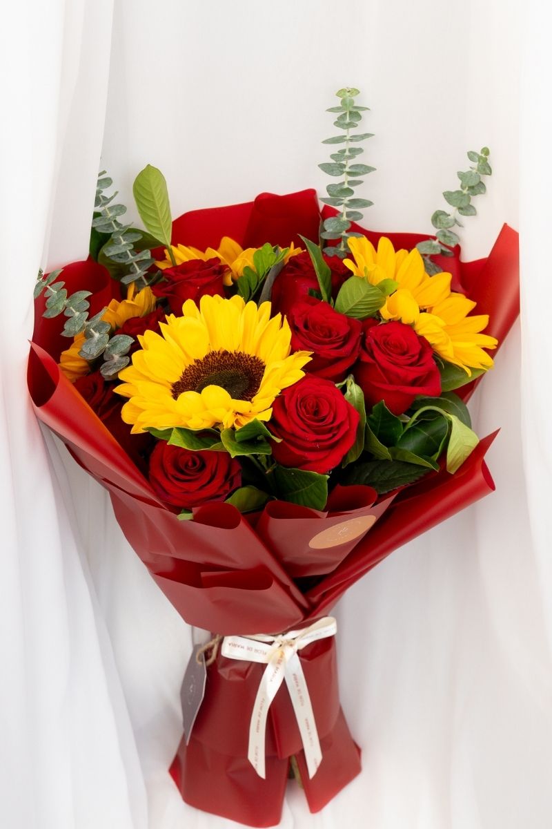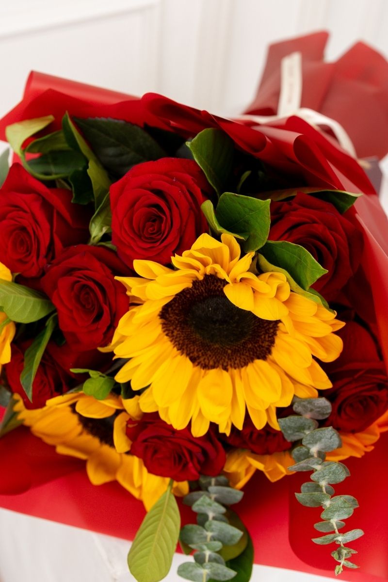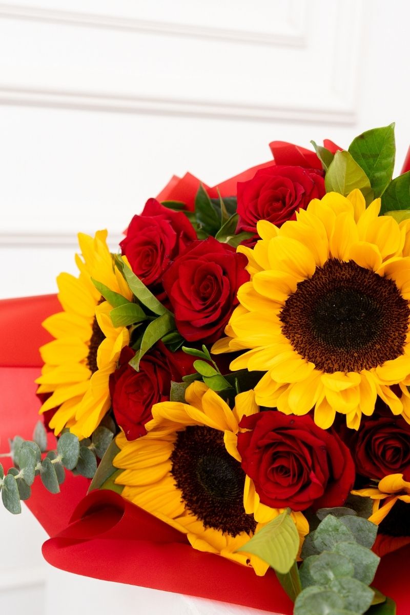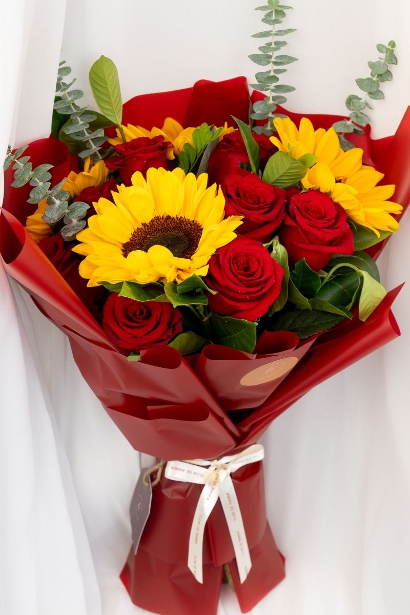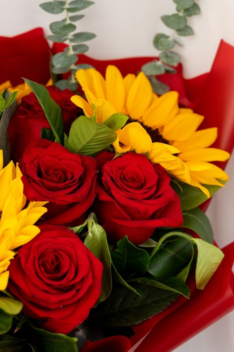 INCLUYE: 4 girasoles frescos + 12 rosas rojas + follaje natural