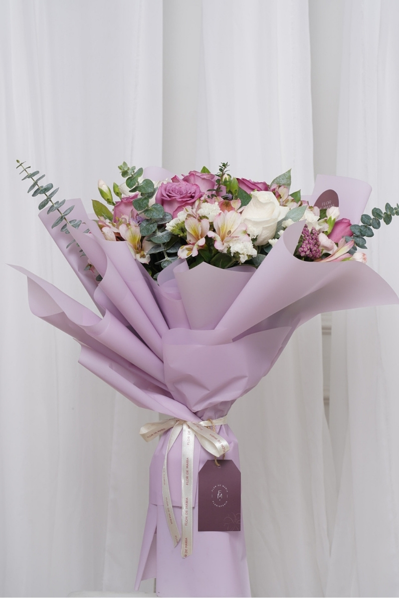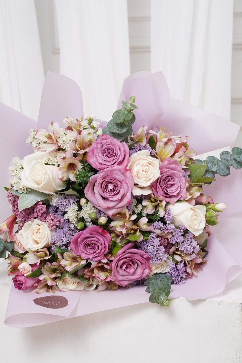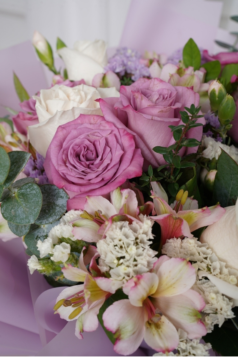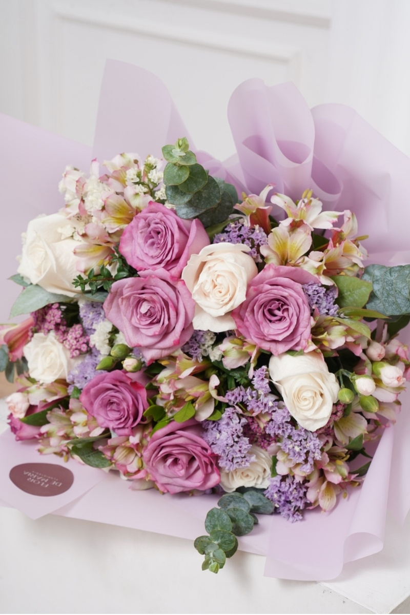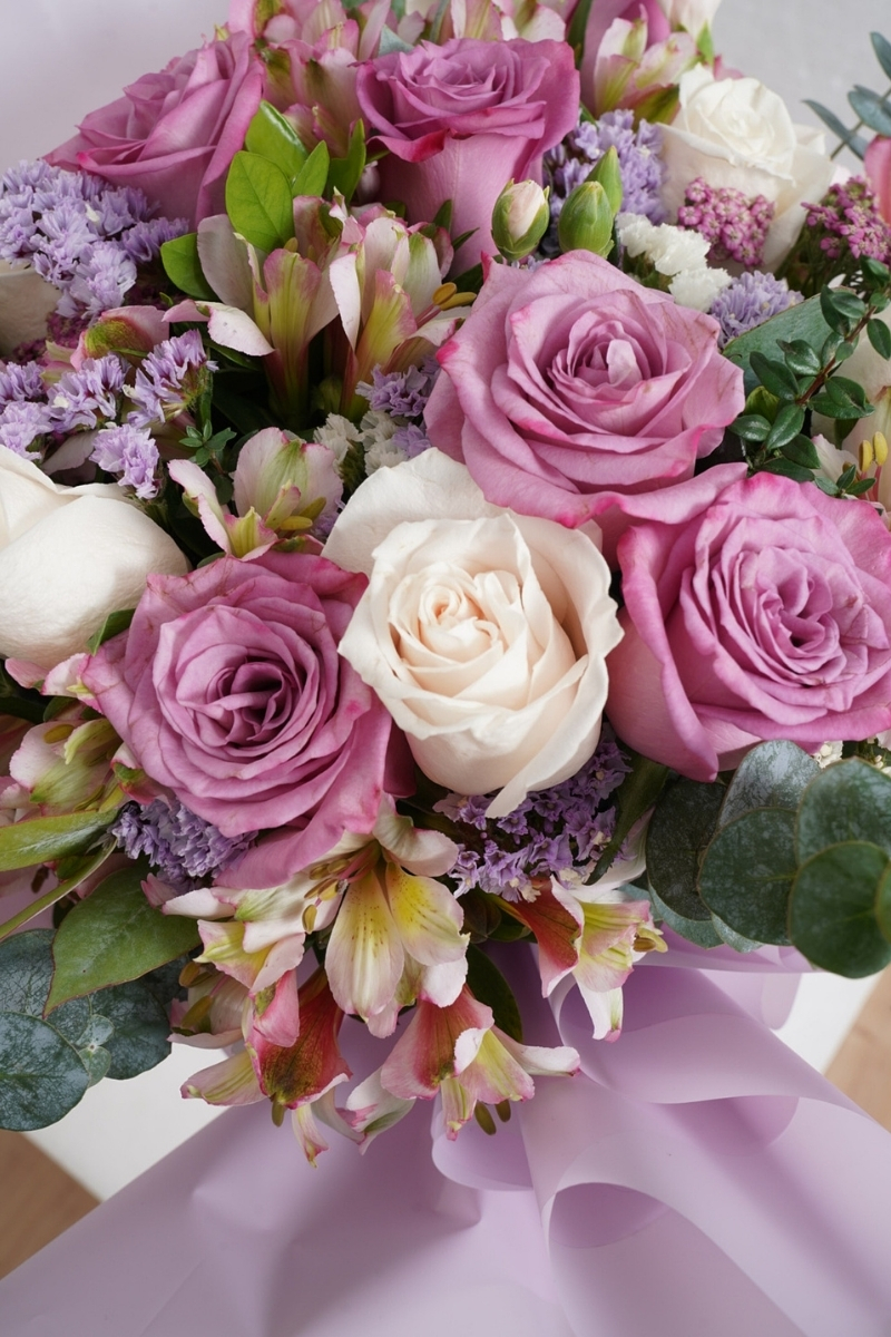 INCLUYE: 6 rosas lilas + 6 rosas blancas + 6 astromelias rosadas o fucsias (según stock) + claveles nacionales + estatis + follaje natural