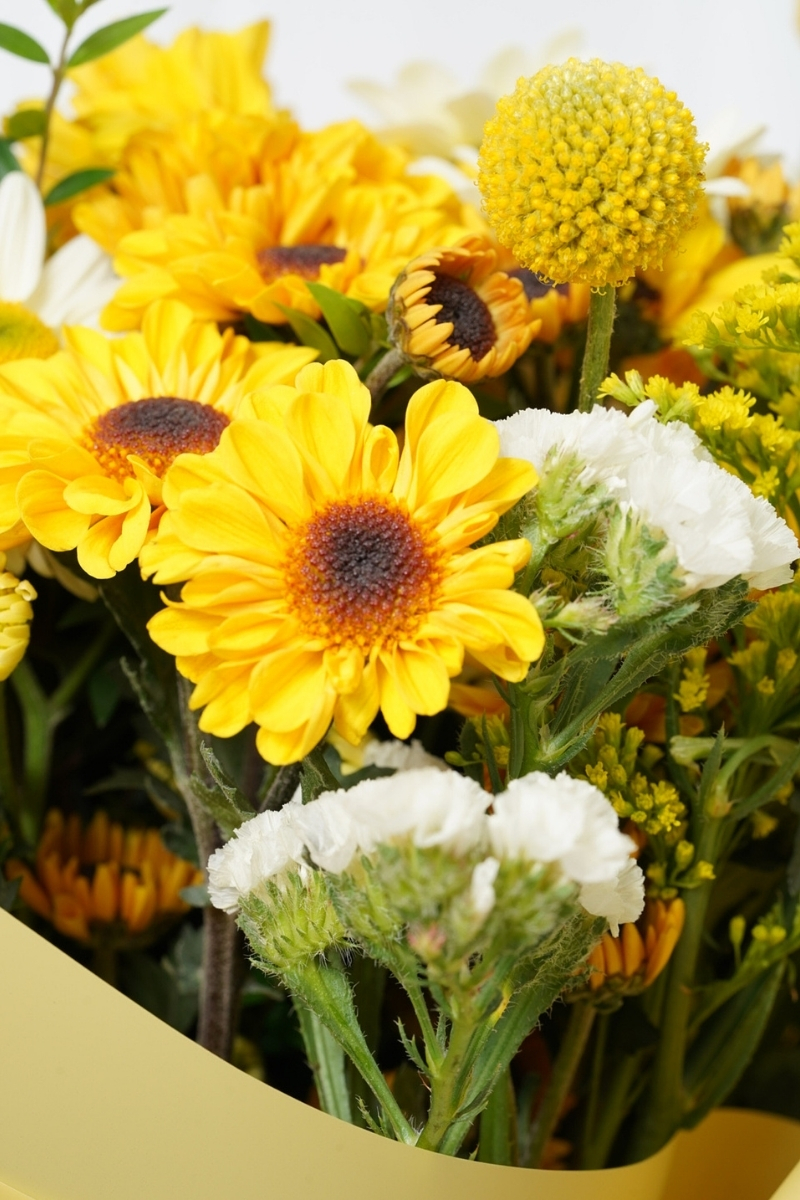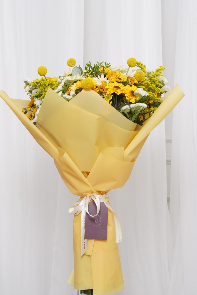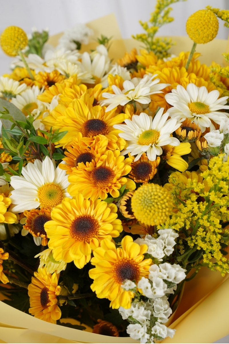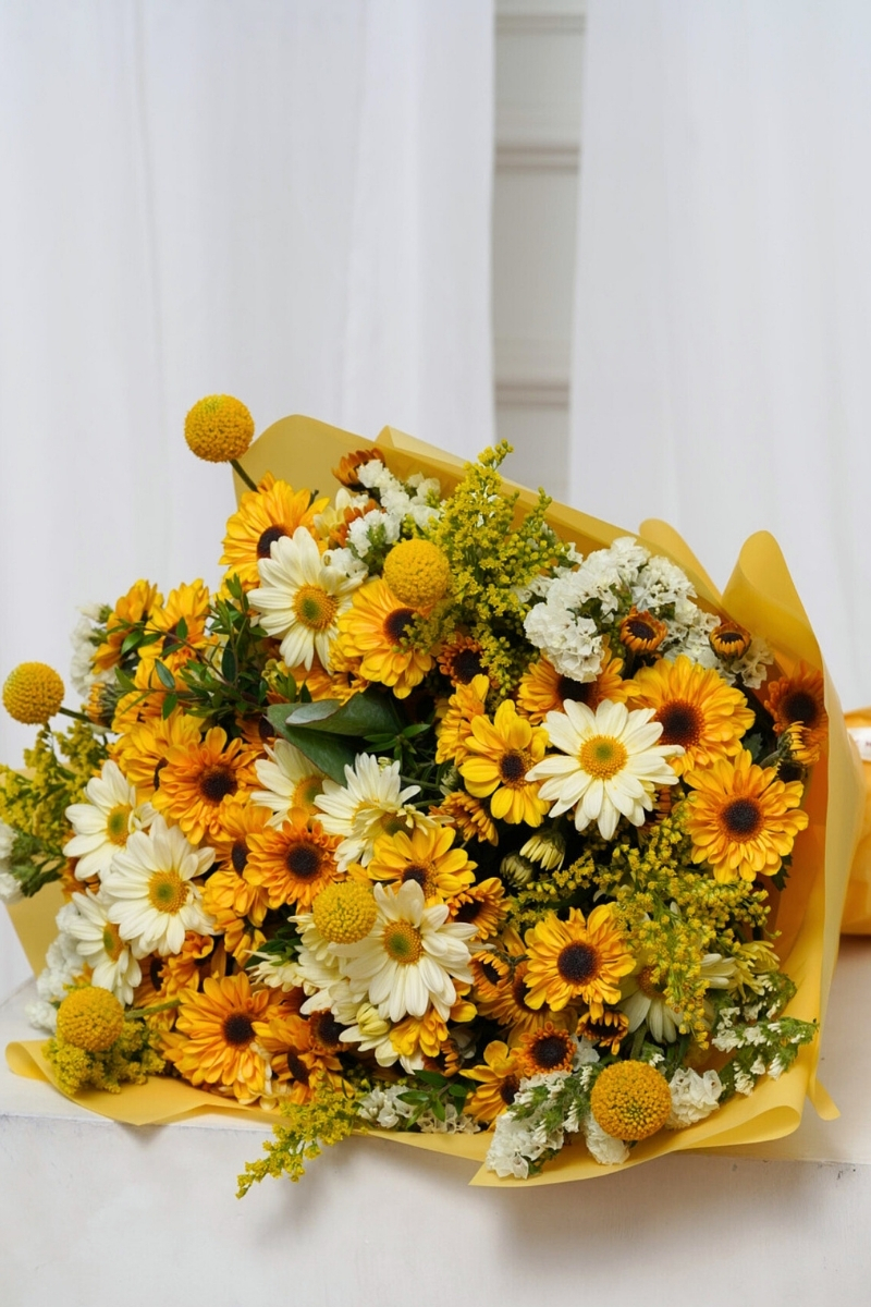 INCLUYE: 15 margaritas (blancas y amarillas) + follaje natural + envoltorio en papel coreano de alta calidad+ lazo decorativo + tarjeta personalizada.