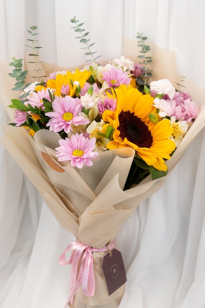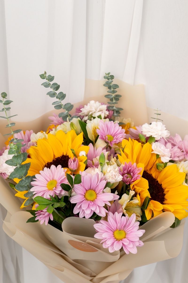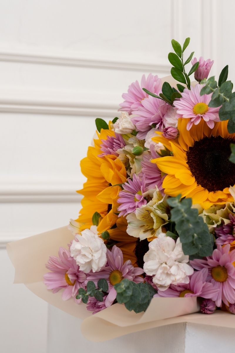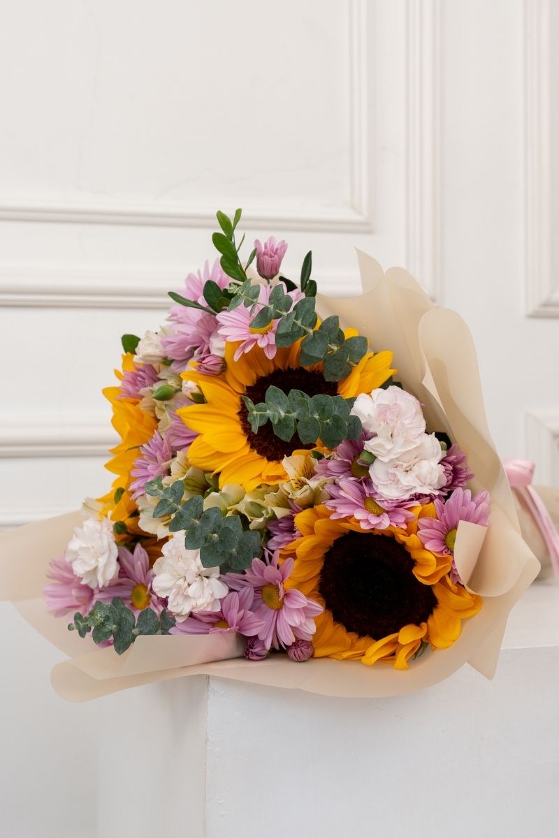 INCLUYE: 4 girasoles frescos + astromelias blancas + margaritas + follaje natural + envoltorio en papel coreano de alta calidad+ lazo decorativo + tarjeta personalizada.